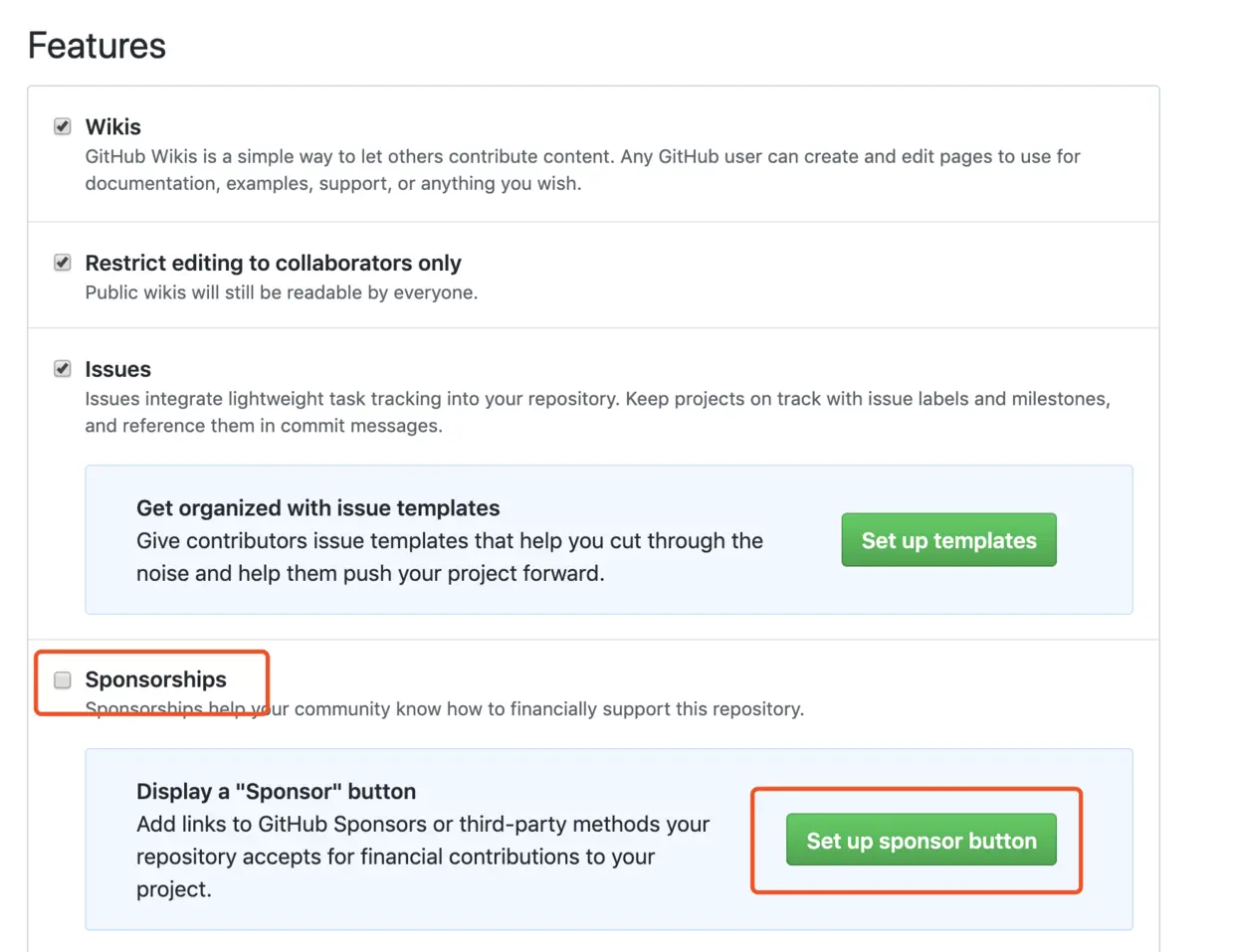 3. 勾选 Sponsorships,然后点击 Set up sponsor button