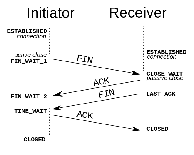 A 收到释放请求后,向 B 发送确认应答,此时 A 进入 TIME-WAIT 状态。该状态会持续 2MSL(最大段生存期,指报文段在网络中生存的时间,超时会被抛弃) 时间,若该时间段内没有 B 的重发请求的话,就进入 CLOSED 状态。当 B 收到确认应答后,也便进入 CLOSED 状态。