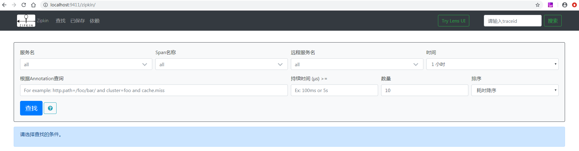 下载之后检查一下自己的jdk环境。最好1.8+版本 最基本的服务启动命令:java -jar zipkin-***.jar 默认端口:9411 启动之后访问:localhost:9411.展示页如下: