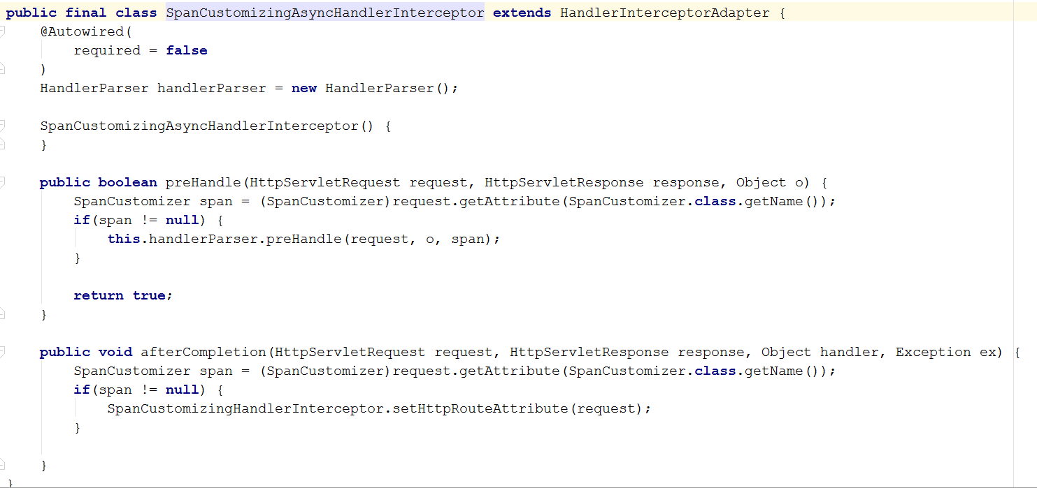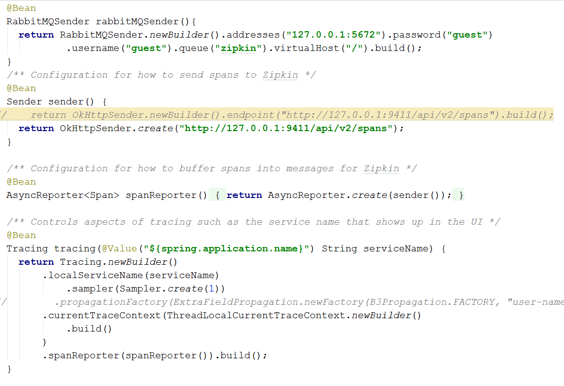 下面简单说明一下zipkin-brave的使用 我们已经知道客户端需要一个拦截功能、封装span功能、发送span功能。那么brave就是帮助我们封装这些功能,我们只要直接拿来用就可以了 在使用之前我们需要考虑我们要拦截什么请求、我们要通过什么渠道发送消息。当我们确定了这两个问题之后只要到官网去找相应的brave包就可以了。下面举一个拦截sping mvc请求、通过rabbitmq发送消息的例子 第一步:先去git上找到sping mvc的brave拦截器、在找到rabbitmq发送的brave发送器 这里说明一下:拦截器在zipkin里面叫instrumentation。发送器叫sender。知道这两个概念可以帮助我们快速搜索,例如我用的是:mvnrepository.com/search。 只要在搜索框输入:brave-instrumentation 就可能看到各种拦截的工具;输入:zipkin-sender 就可以看到各种发送器 对于brave的源码地址如下:github.com/openzipkin/… 在这里可以看到源代码。帮助我们了解具体实现,也可以直接复制源代码到自己的项目里面实现拦截功能 我引入jar包:brave-instrumentation-spring-webmvc。我们看一下源码也是很简单。就是定一个SpanCustomizingAsyncHandlerInterceptor拦截器 引入jar包:zipkin-sender-amqp-client 发送mq消息。对于其他的依赖包可以通过:mvnrepository.com/search来查看。 下面简单截一段代码: