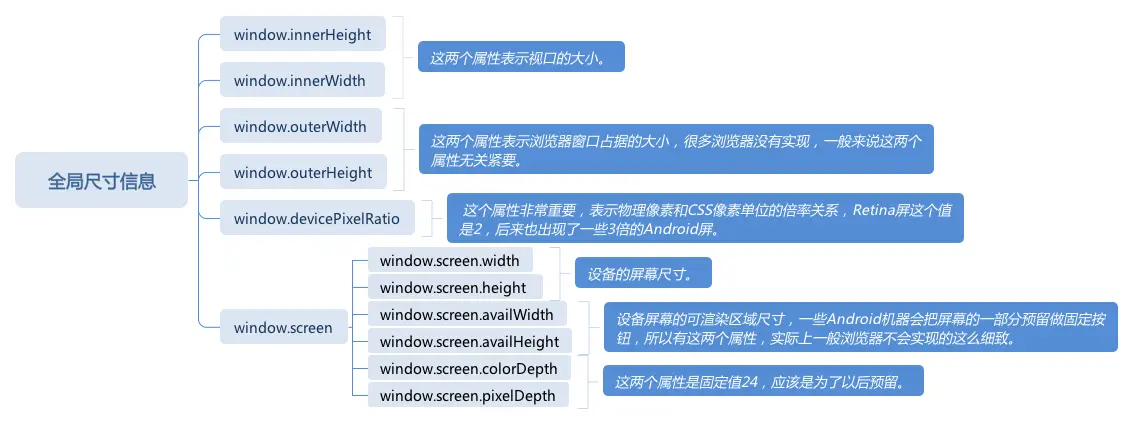 - window.screen.availWidth, window.screen.availHeight 设备屏幕的可渲染区域尺寸,一些Android机器会把屏幕的一部分预留做固定按钮,所以有这两个属性,实际上一般浏览器不会实现的这么细致。