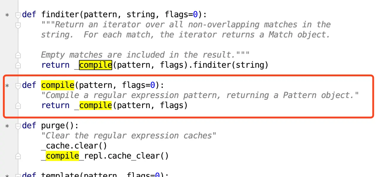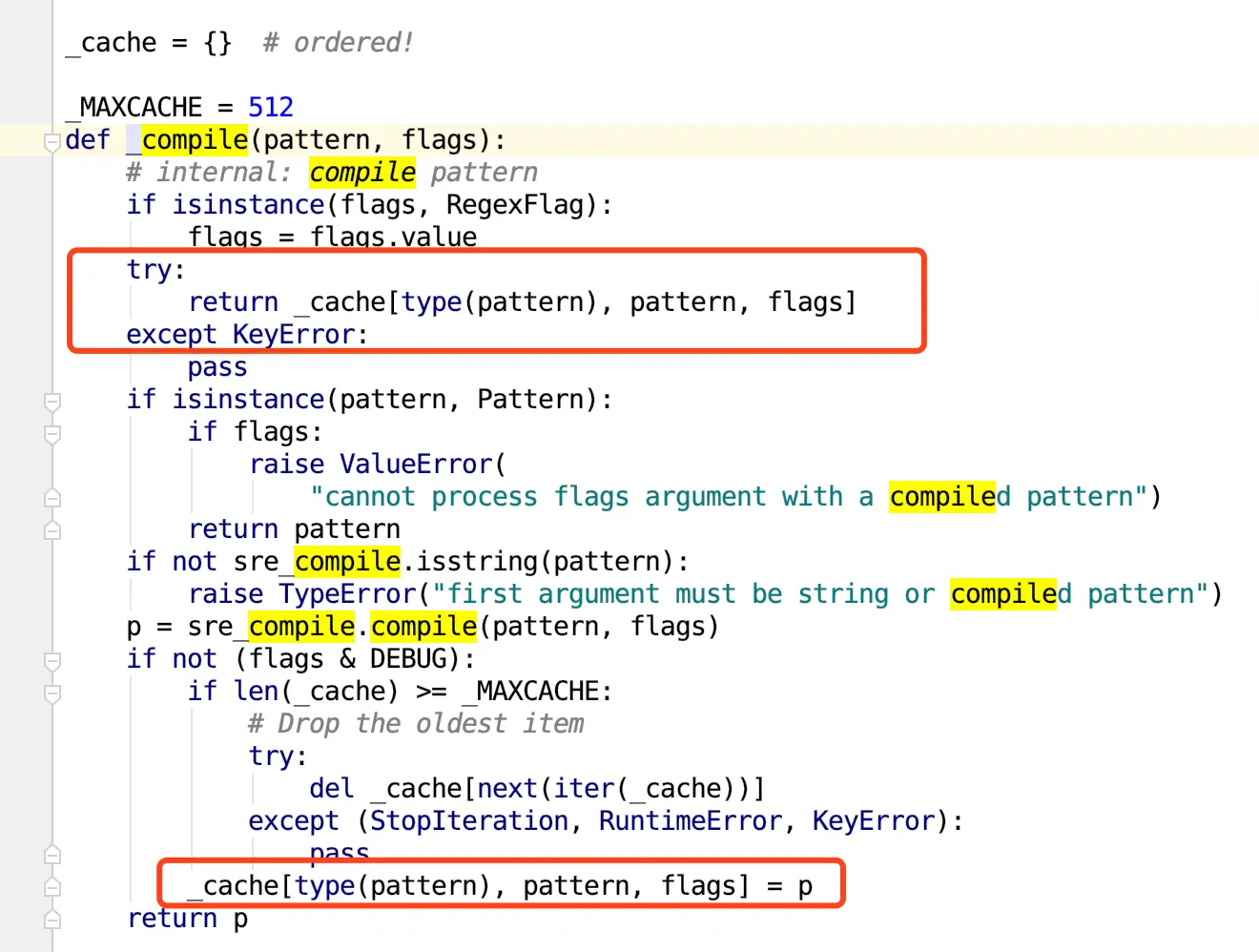 红框中的代码,说明了_compile自带缓存。它会自动储存最多512条由type(pattern), pattern, flags)组成的Key,只要是同一个正则表达式,同一个flag,那么调用两次_compile时,第二次会直接读取缓存。