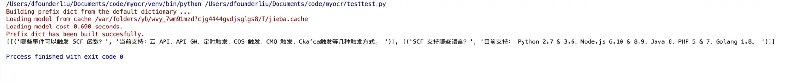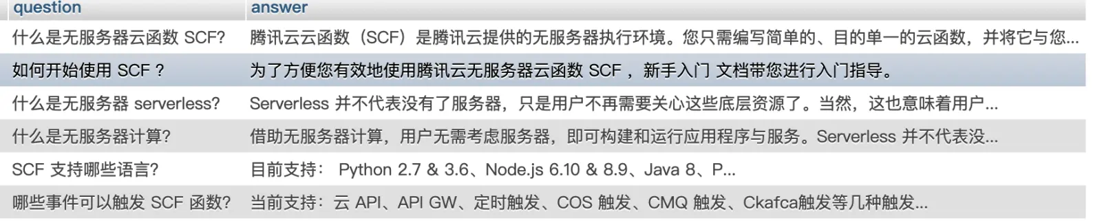 我们一共有5个问题,这5个问题,和"怎么触发SCF?"相似度最高的问题前两个是:那些事件可以触发SCF函数以及SCF支持那些语言。可以看出,得到的结果是类似的。