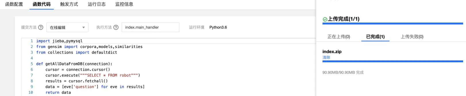 return putQuestion(sentence)目前,我们的云函数已经部署完成。