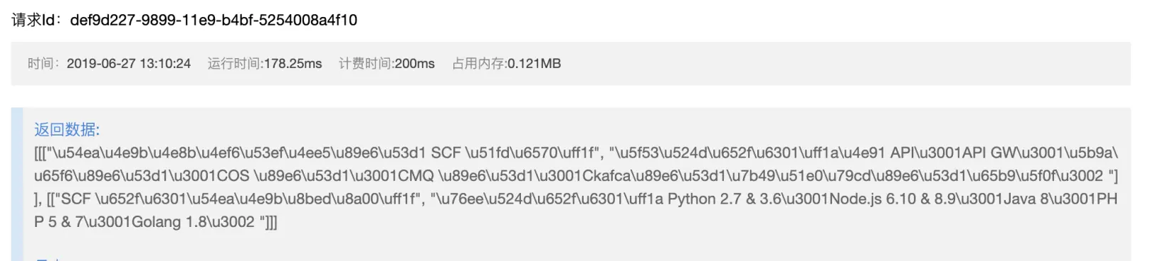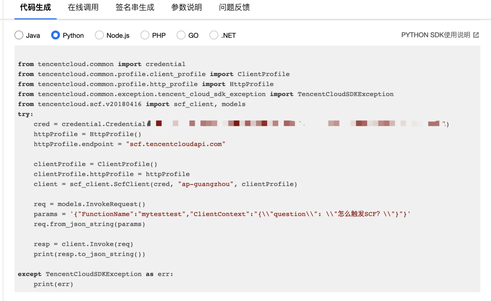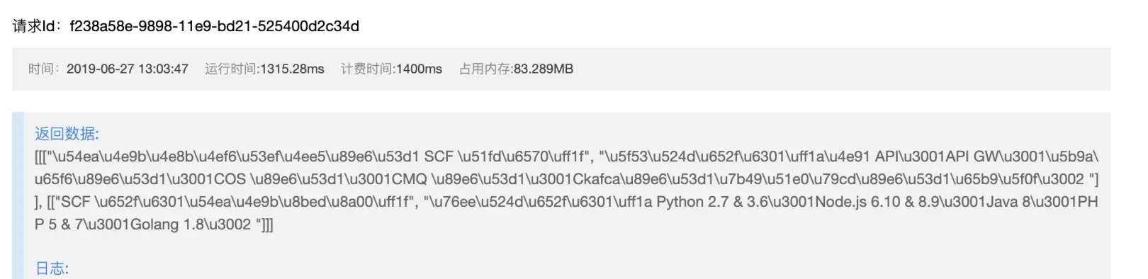 我们可以看到系统为我们自动生成了Java、Python等6种语言的代码,这些代码是可以放到项目中直接运行。也就是说,你可以在自己的Node.js,.NET,Java等项目中,调用这个云函数,并且获得结果。