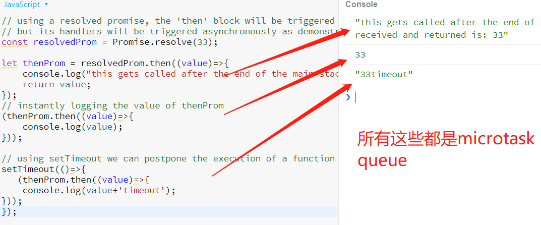- 如果修改一下,则发现如下结果,因为microtask运行按照queue来的