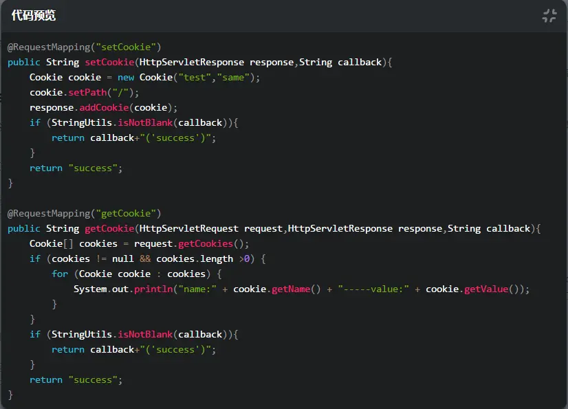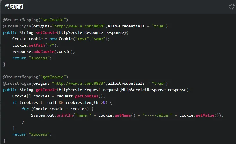 我们了解了浏览器的同源策略,接下来就看一看同域下的前后端分离,首先看服务端能不能设置Cookie,具体代码如下: