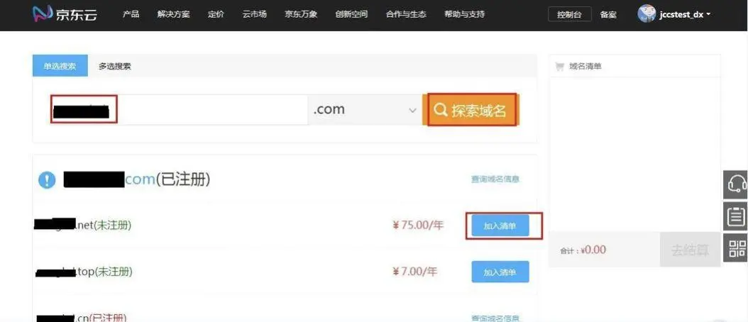 加入购物车:选择想要注册的域名,点击“立即结算”前往购物车,在购物车中,选择注册年限并勾选域名注册协议。