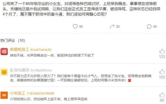 最近,有一位程序员在网上说了这么一件事:我们部门新来了一个小女生,对领导各种巴结讨好,每天早到晚走,事事想在领导前面,关键她还是外包试用期,她这么表现让我们这些老员工显得很平庸,被领导骂,应该怎么办?