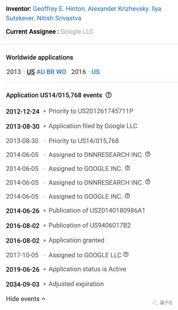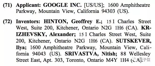 专利文件上填的发明者,也是这篇论文的各位作者,只不过申请者是谷歌:
