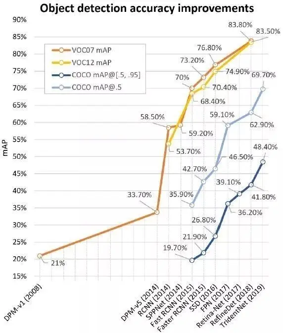 图中的里程碑检测器: VJ Det, HOG Det,DPM, RCNN, SPPNet, Fast RCNN, Faster RCNN, YOLO, SSD, PyramidNetworks,RetinaNet。