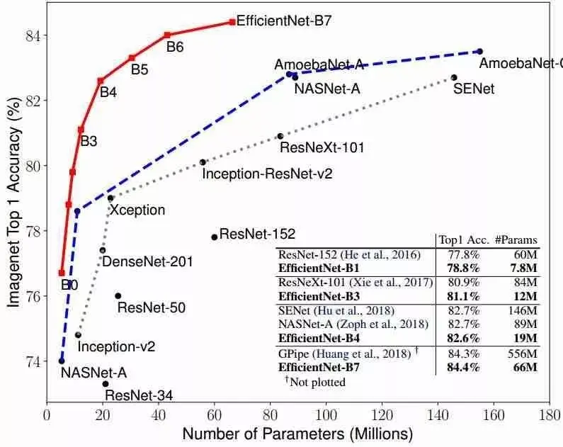 目前,随着NASNet(Neural Architecture Search Network)的崛起,效果好的基本都是这些网络比如:NASNet、PNasNet、AmoebaNet,尤其是近Google新出的EfficientNet,更是对其他网络有碾压式的提升,下面的图片一目了然: