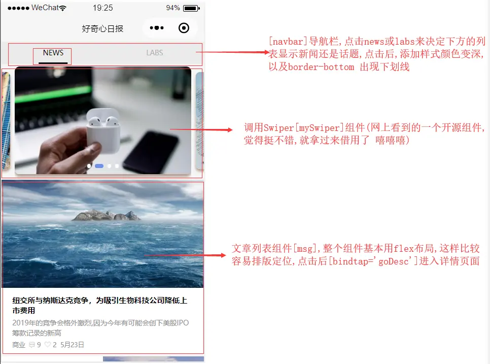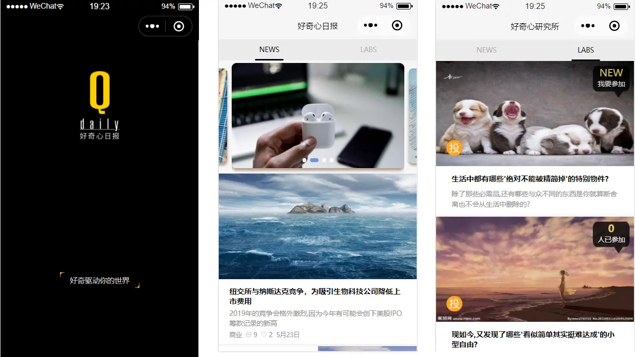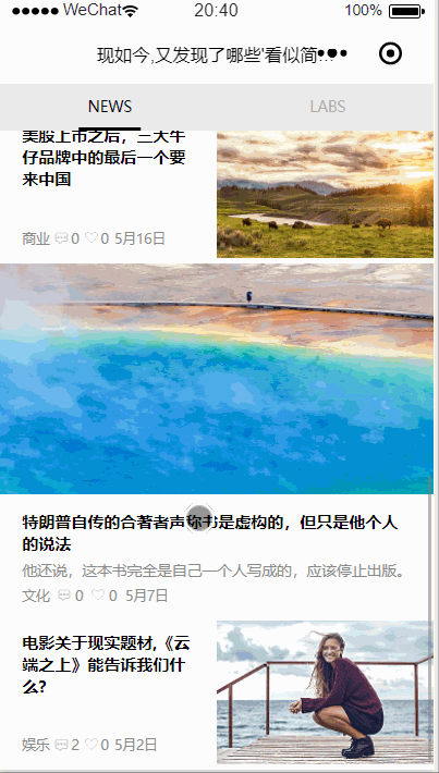 最近在学习小程序,了解的越多,就越想自己也动手实现一个,所谓学以致用吗,正巧最近也看到一个挺有趣,而且看起来也挺简洁大方的一个小程序--"好奇心杂志",便想着自己去模仿写一个.结果还行,就是碰巧最近比较忙,所以最后写的挺仓促的,不过总体还是达到了我预计的目标.
