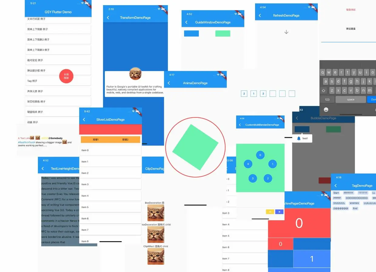 GSYFlutterDemo 作为简单示例和解决方案 Demo ,它可以给你学习和工作中提供一些便捷的帮助,比如 如何自定义布局,如何滚动控件到指定 child position ,如何调整 Text 控件的 Line Space ,如何监听键盘的弹出和收起 等等,所以例子方案都独立实现,方便阅读 CV 。