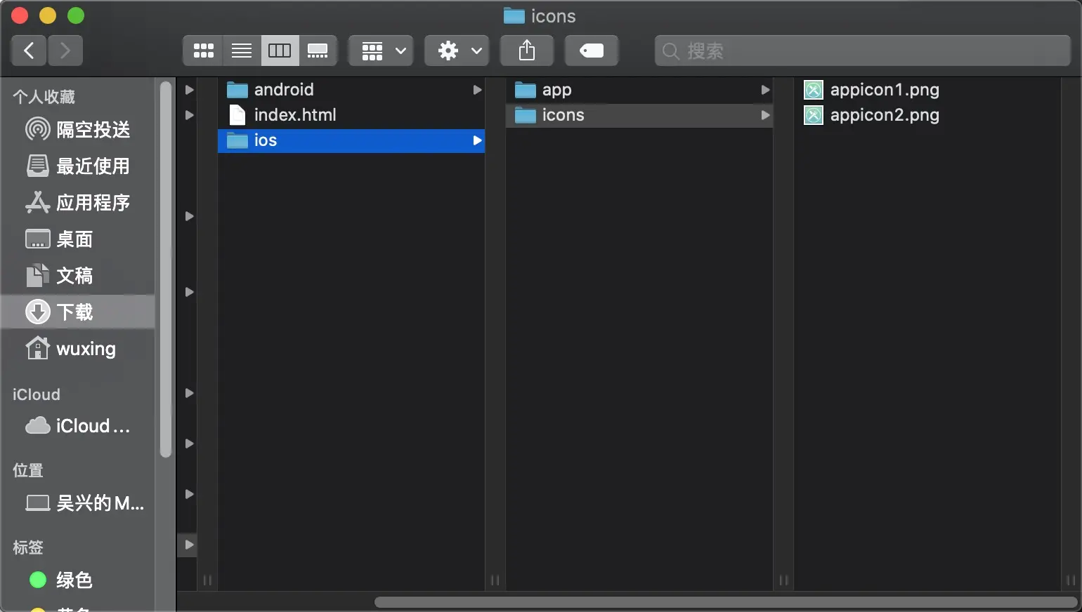 在ios文件夹下再新建一个icons文件夹,把准备好的两张图片丢进去,57和512的,像这样