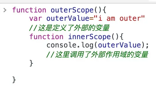 我们先定义一个函数里面声明一个变量叫outerValue再在函数的里面再创建一个函数调用该变量