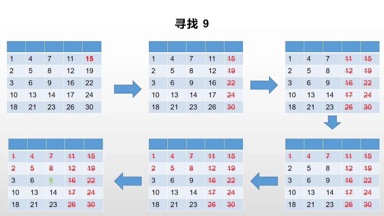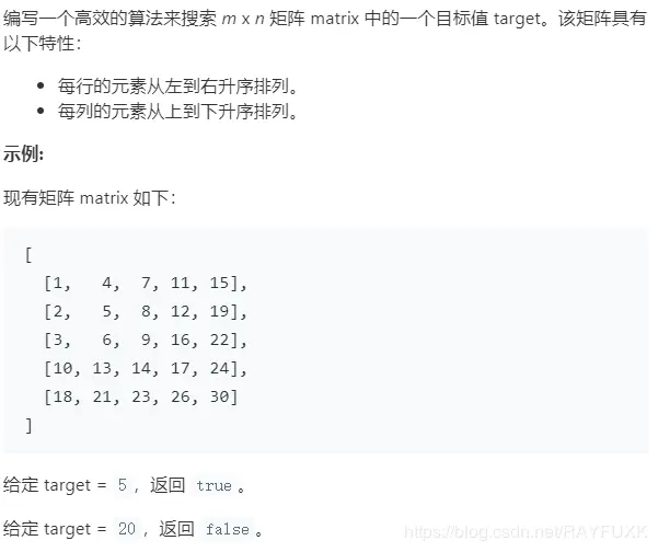 首先,不得不说这题和他的第一个版本的思想上是有点像的,但是又不是完全一样,因为第一版本中我们可以吧取值的范围缩小到一行当中,但是在这里是行不通的,因为这题的关键的是,最后答案的取值取值范围会呈现出一个矩形的形状分布。 这个题目的需要你从右上角的元素或者左下角的元素开始寻找。 如果目标比当前的元素大,那么就把这一行排除;如果目标值比当前的元素小,那么就把之一列给排除。 我把整个寻找的过程做了流程图,方便大家理解: