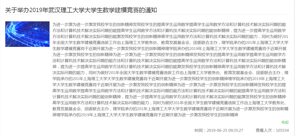 content: '为进一步激发我校学生生的精神,提高为进一步激发我校学生的创新精神学生运用数学方法和计算机技提高学力,同时为做好201年全国大学生数学建模竞赛选拔工作由上海理工大学教务处、教育发展基金会、团委联合主办,理学院承办的201年上海理工大学大学生数学建模竞赛将于近期开展为进一理学院承办的2019年上海理工大学大学生数学建模竞',