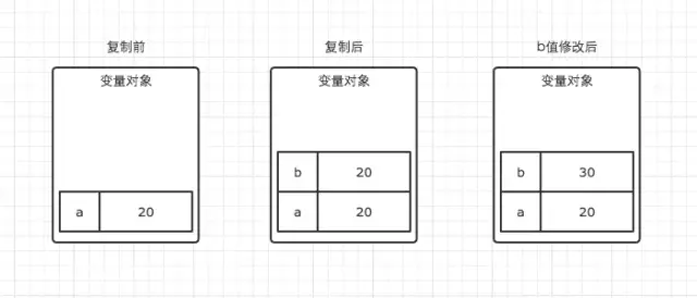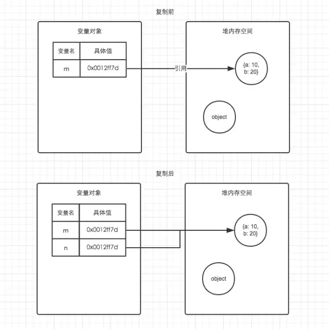 var b = { m: 20 }; // 变量b存在于变量对象中,{m: 20} 作为对象存在于堆内存中