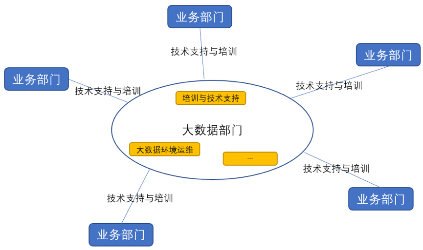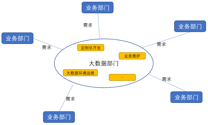 传统数据仓库和BI的组织结构都是集中相关技术人员成立独立大数据部门,各个业务部门向其提需求,做定制化开发。