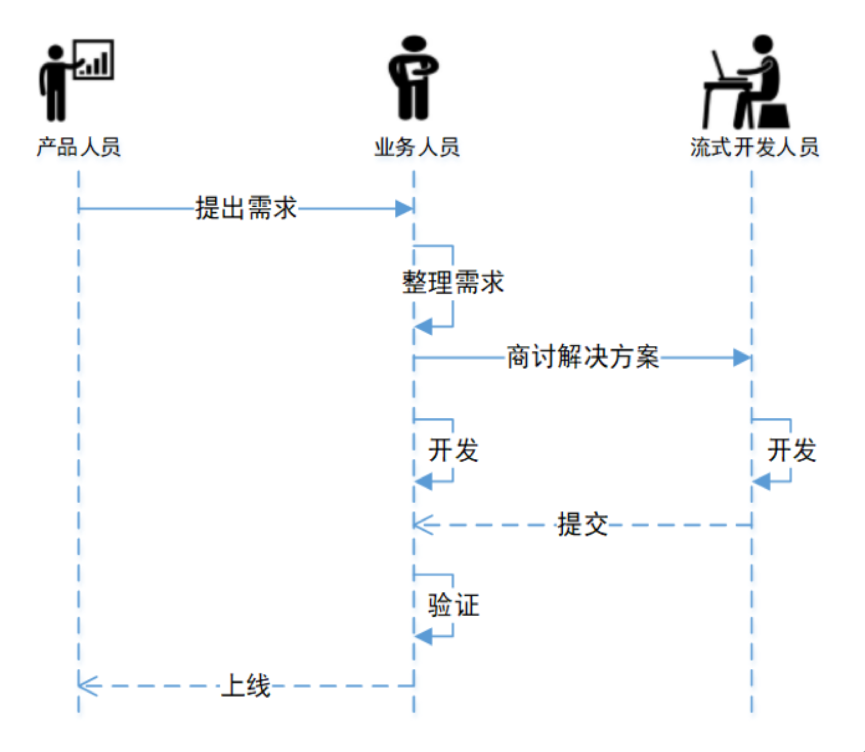从此图可以看出,至少需要3个角色的人员才能完成一个需求,而且流式开发人员要花很多时间了解需求、业务、表结构等等。