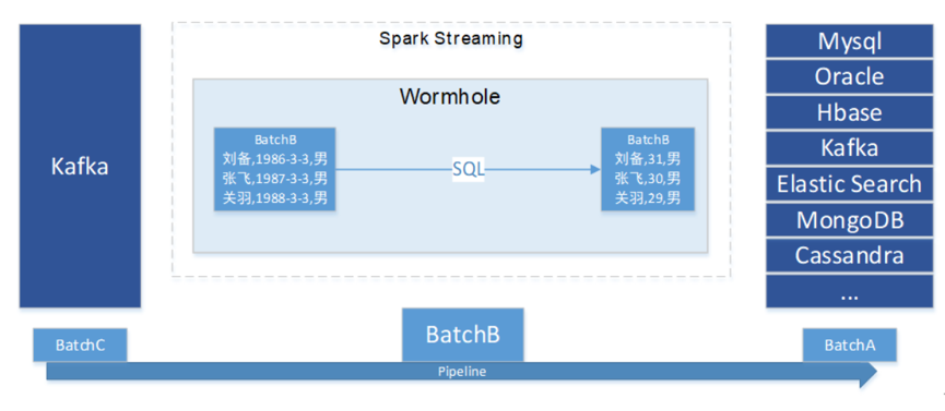 Wormhole主要基于Spark技术,实现了基于SQL的流上数据处理和异构系统幂等写入等相关功能。如上图所示,Wormhole接入流上的数据,然后将数据中的出生日期通过用户编写的SQL处理为年龄,写入到另外一个存储系统中。
