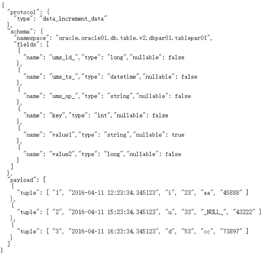 - UMS支持每一个消息中存在一份Schema信息及多条数据信息,这样,在存在多条数据时可以降低数据大小,提高处理效率
