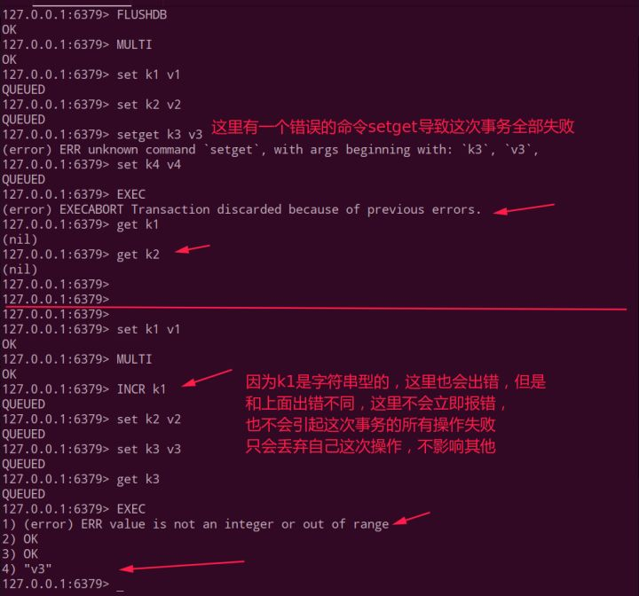 下面的演示说明: Redis是部分支持事务的。不保证原子性。