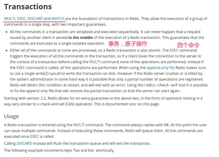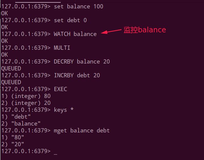 push/pop过了,整个事务队列都不会被执行。 - 通过WATCH命令在事务执行之前监控了多个Keys,倘若在WATCH之后有任何Key的值发生了变化, EXEC命令执行的事务都将被放弃,同时返回Nullmulti-bulk应答以通知调用者事务执行失败。