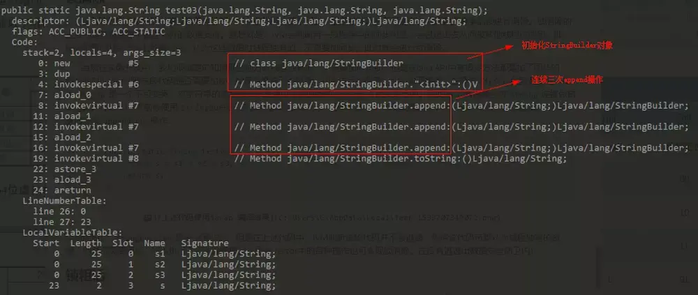 当然在实际开发中,我们很清楚的知道那些地方时线程独有的,不需要加同步锁,但是在Java API中有很多方法都是加了同步的,那么此时JVM会判断这段代码是否需要加锁。如果数据并不会逃逸,则会进行锁消除。比如如下操作:在操作String类型数据时,由于String是一个不可变类,对字符串的连接操作总是通过生成的新的String对象来进行的。因此Javac编译器会对String连接做自动优化。在JDK 1.5之前会使用StringBuffer对象的连续appen()操作,在JDK 1.5及以后的版本中,会转化为StringBuidler对象的连续append()操作。