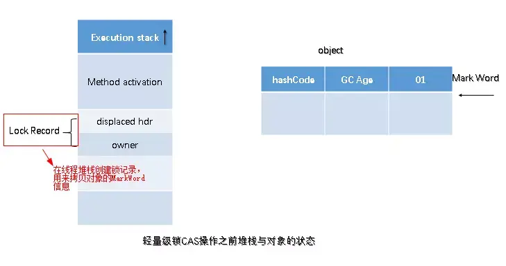 如上图所示:如果当前对象没有被锁定,那么锁标志位位01状态,JVM在执行当前线程时,首先会在当前线程栈帧中创建锁记录Lock Record的空间用于存储锁对象目前的Mark Word的拷贝。