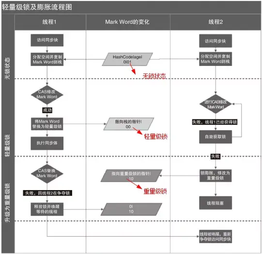 轻量级解锁时,会使用原子的CAS操作将Displaced Mark Word替换回到对象头中,如果成功,则表示没有发生竞争关系。如果失败,表示当前锁存在竞争关系。锁就会膨胀成重量级锁。两个线程同时争夺锁,导致锁膨胀的流程图如下:
