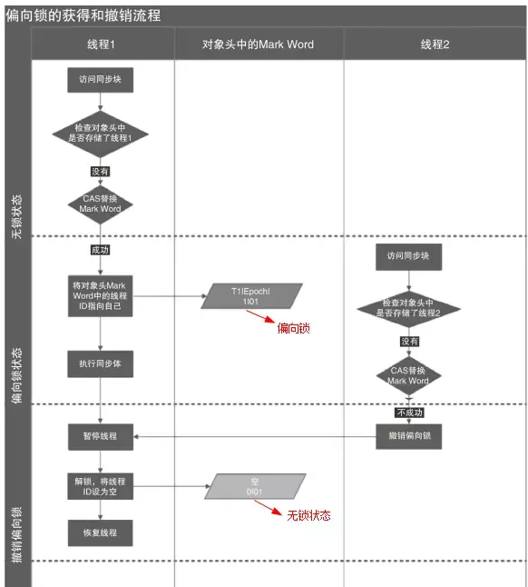 为了解决这一问题,HotSpot的作者在Java SE 1.6 中对Synchronized进行了优化,引入了偏向锁。当一个线程访问同步快并获取锁时,会在对象头和栈帧中的锁记录里存储锁偏向的线程ID,以后该线程在进入和推出同步块时不需要进行CAS操作来加锁和解锁。只需要简单地测试一下对象头的Mark Word里是否存储着指向当前线程的偏向锁。如果成功,表示线程已经获取到了锁。