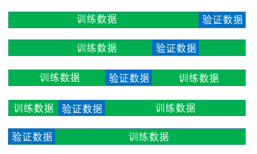 比如,如果我们想做5轮交叉验证,那么就分别把最原始的训练集分成5中情况,如图: