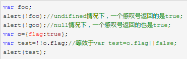 这段例子,演示了在undifined和null时,用一个感叹号返回的都是true,用两个感叹号返回的就是false,所以两个感叹号的作用就在于,如果明确设置了变量的值(非null/undifined/0/”“等值),结果就会根据变量的实际值来返回,如果没有设置,结果就会返回false。