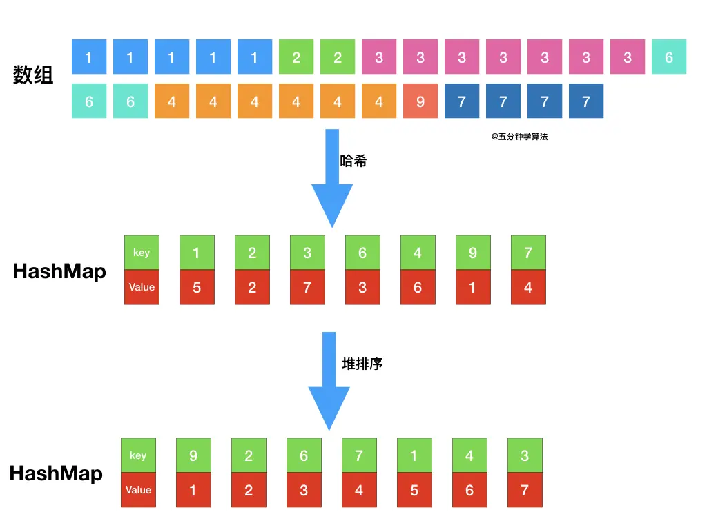 - 如果新的元素的频率比堆顶端的元素大,则弹出堆顶端的元素,将新的元素添加进堆中
