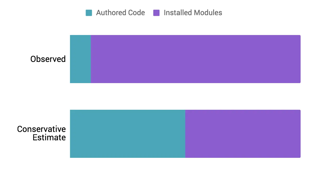 当前生成现代 bundle 与传统相对应 bundle 的解决方案仅仅关注于『业务代码』——— 我们写的应用程序代码。这些方法目前无法帮我们处理从 npm 安装的源码 ——— 这是一个问题,因为一些代码将安装类型的代码与编写类型代码的比例控制在 10:1 范围之内。尽管这个比例在每个工程内都明显不同,我们总能发现发给用户的 JavaScript 包含大量的安装类型的代码。即使回过头来看,也有明显的迹象表明生态系统倾向于安装现有模块,而非编写一次性使用模块。