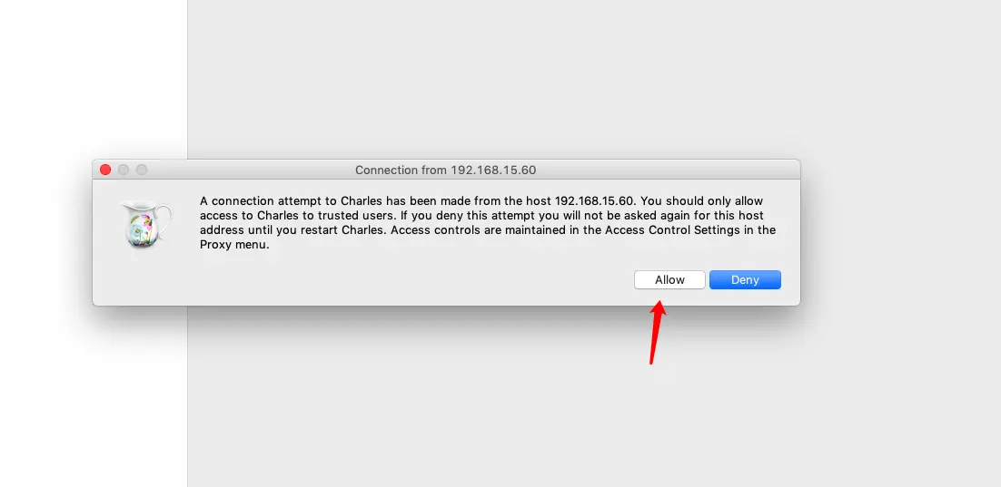 在设置好代理之后,就可以用手机来连接代理了,在手机连接代理后会弹窗提示要不要允许连代理,点击allow按钮,同意连接。