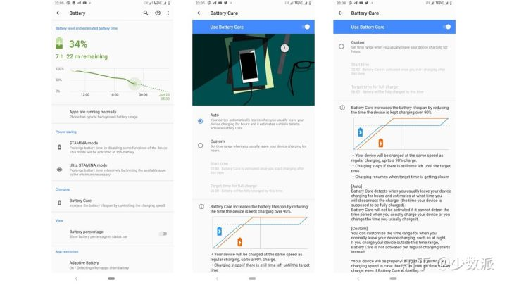 这些功能或是利用某些智能算法、或是通过新起的机器学习,来自动判断电池应该在何时停止充电、何时充满。Xperia 1 所搭载的 Battery Care 还可以由用户来对这些项目进行自定义设置。