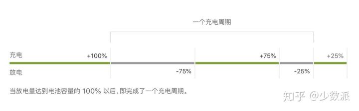 第一个因素是循环(Cycles)。这个在 Apple 的官方文档中已被统一写作为「充电周期」,方便理解的话你也可以认为是放电周期,其 定义 为「当放电量达到电池容量的 100% 以后,即完成了一个充电周期。」