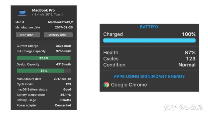 在 macOS 上,这类工具就更多了,前文提到的 coconutBattery 也可测量 MacBook 的电池健康度,著名的系统监视应用 iStat Menus 也可以在电池项中查看到当前的电池健康度。