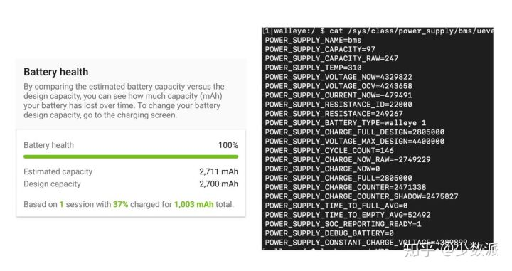 另一个碰运气的办法是在手机的 shell 中输入指令 cat /sys/class/power_supply/bms/uevent (无需 Root 权限)来获得一串关于电池的数据,但其中 POWER_SUPPLY_CHARGE_FULL 这个参数一直没变让我不敢确信这是真实的电池健康度。也许各个厂商的政策各不相同,导致这串数据并无什么实际参考意义。