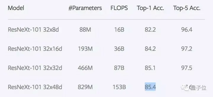 其中,32×48d的准确率 (Top-1) 刷新了ImageNet的纪录。