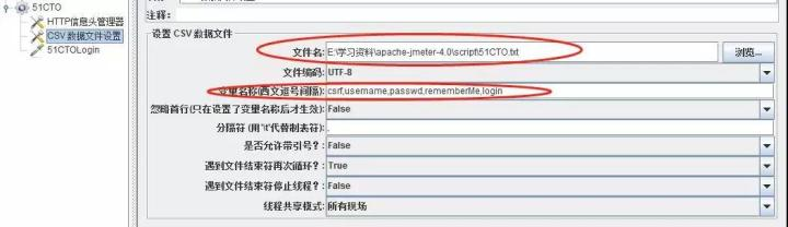 然后创建CSV数据设置文件,导入该文件并且设置变量名称,见截图: