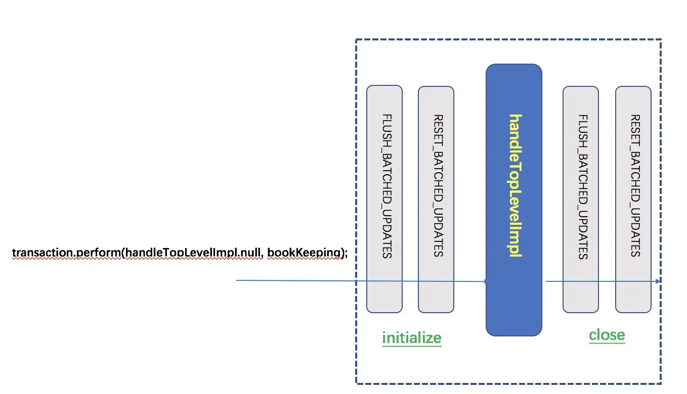 简单地说,一个Transaction 就是将需要执行的 method 使用 wrapper 封装起来,再通过 Transaction 提供的 perform 方法执行。而在 perform 之前,先执行所有 wrapper 中的 initialize 方法;perform 完成之后(即 method 执行后)再执行所有的 close 方法。一组 initialize 及 close 方法称为一个 wrapper,从上面的示例图中可以看出 Transaction 支持多个 wrapper 叠加。