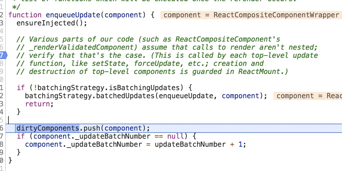 - 如果组件当前正处于update事务中,则先将Component存入dirtyComponent中。否则调用batchedUpdates处理。