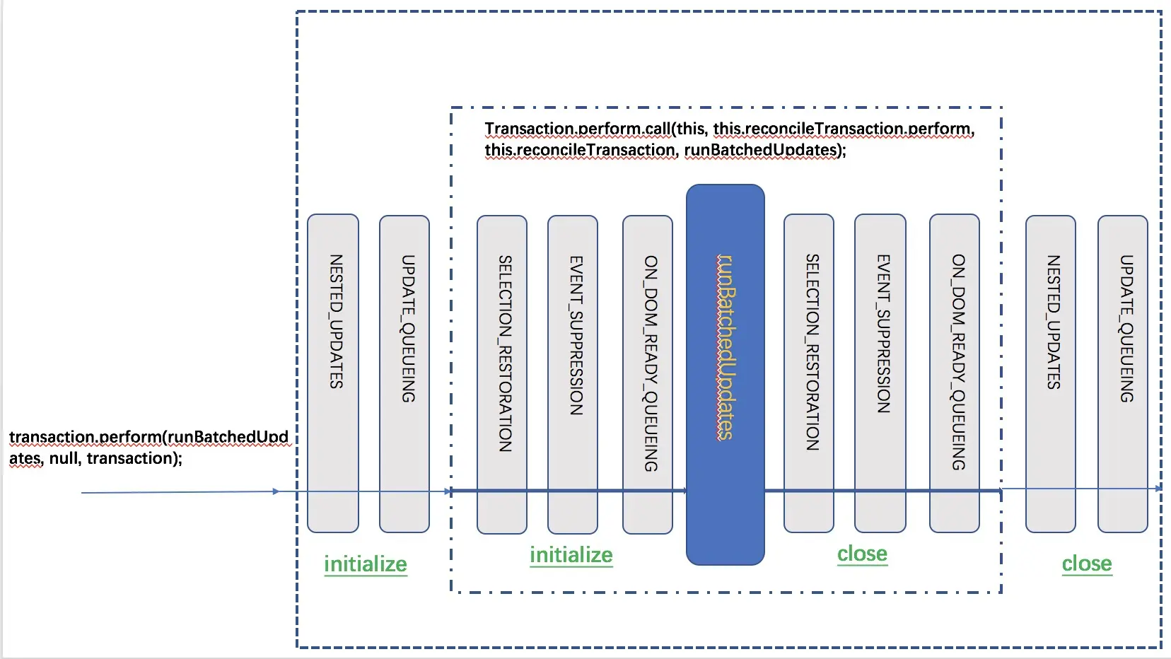 var TRANSACTION_WRAPPERS = [NESTED_UPDATES, UPDATE_QUEUEING];根据上面的事务详细图可知道