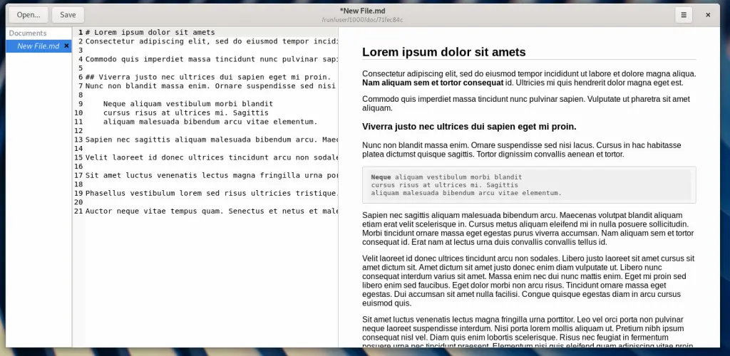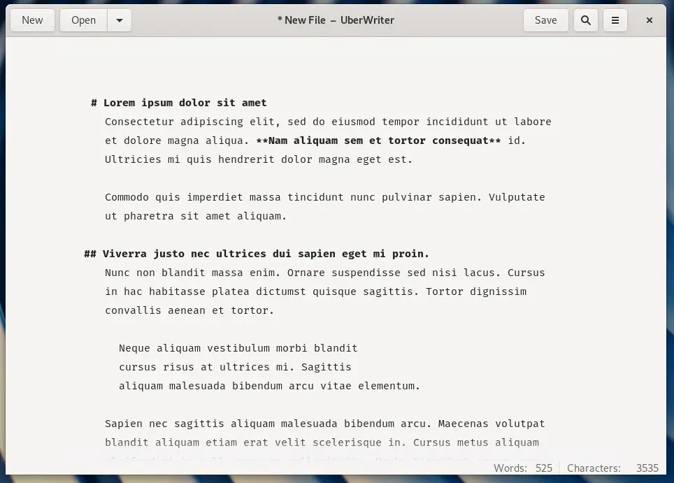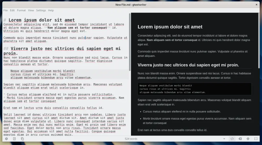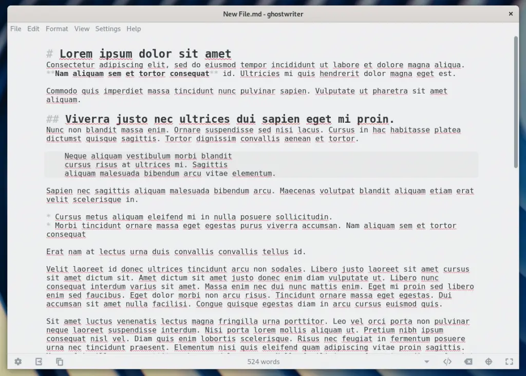 以前的编辑更专注于最小的用户体验,Ghostwriter 提供了更多的功能和选项。Ghostwriter 提供了一个文本编辑器,当你以 Markdown 格式书写时,编辑器将 Markdown 部分样式化。粗体标记文本显示为粗体,标题标记显示为较大的字体,以帮助编写 Markdown 标记。