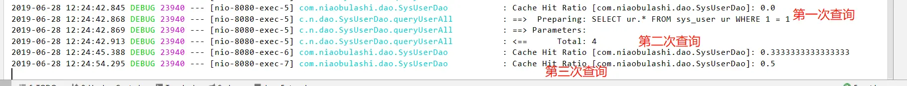 可以看到,第二次和第三次查询没有查询数据库的SQL打印,而是去数据库获取数据