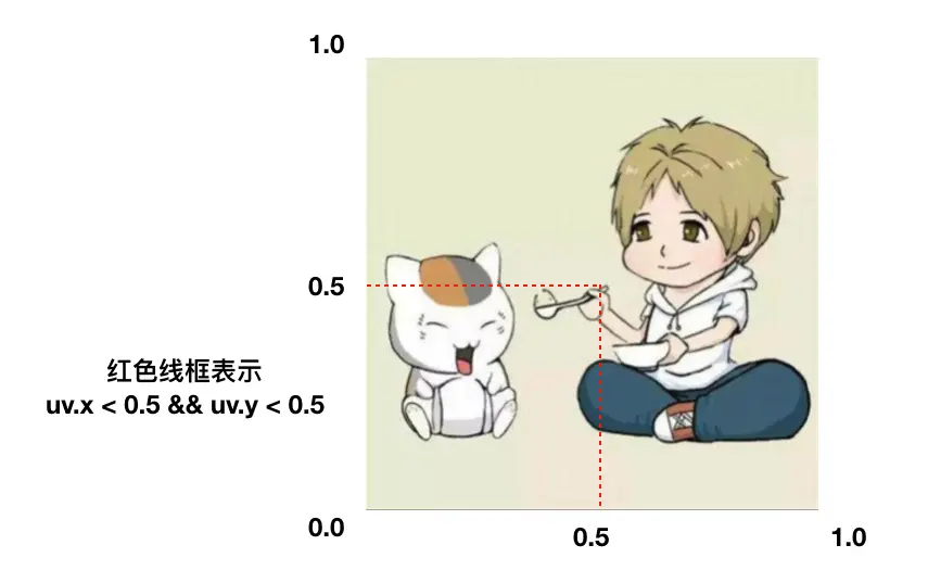 假设,这里取的是0.25~0.75这一段的图片显示,则需要获取上图红色框里的纹素。 通过前面的学习,很容易想得到,把纹理传递到片元着色器里,然后提取纹理像素,然后进行渲染,下面看代码: